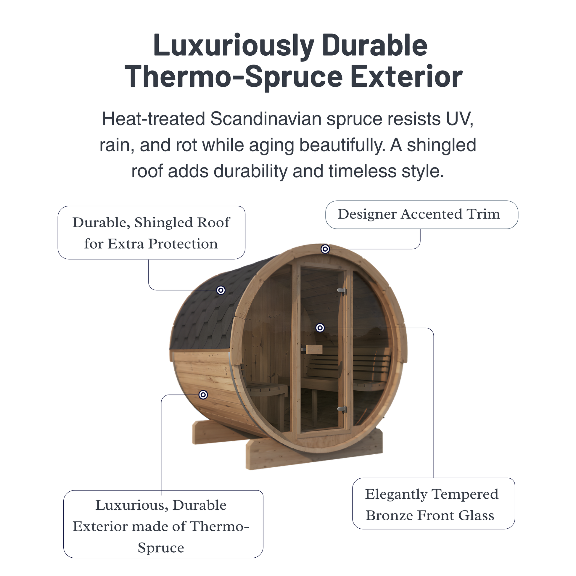 The SaunaLife Model E7G is a premium 4-person outdoor barrel sauna featuring a spacious 6’5” interior height, ergonomic contoured Thermo-Aspen benches, and a stunning full-glass tempered front for panoramic views. Built from 1.65” thick Thermo-Spruce staves that last up to 2X longer than cedar, it delivers superior thermal performance, stainless steel barrel bands, a watertight shingle roof system, dual floor drains, and Wi-Fi controlled IP67 LED lighting. The E7G is built with precision crafted in Northern Europe for long-term durability and elevated backyard wellness.