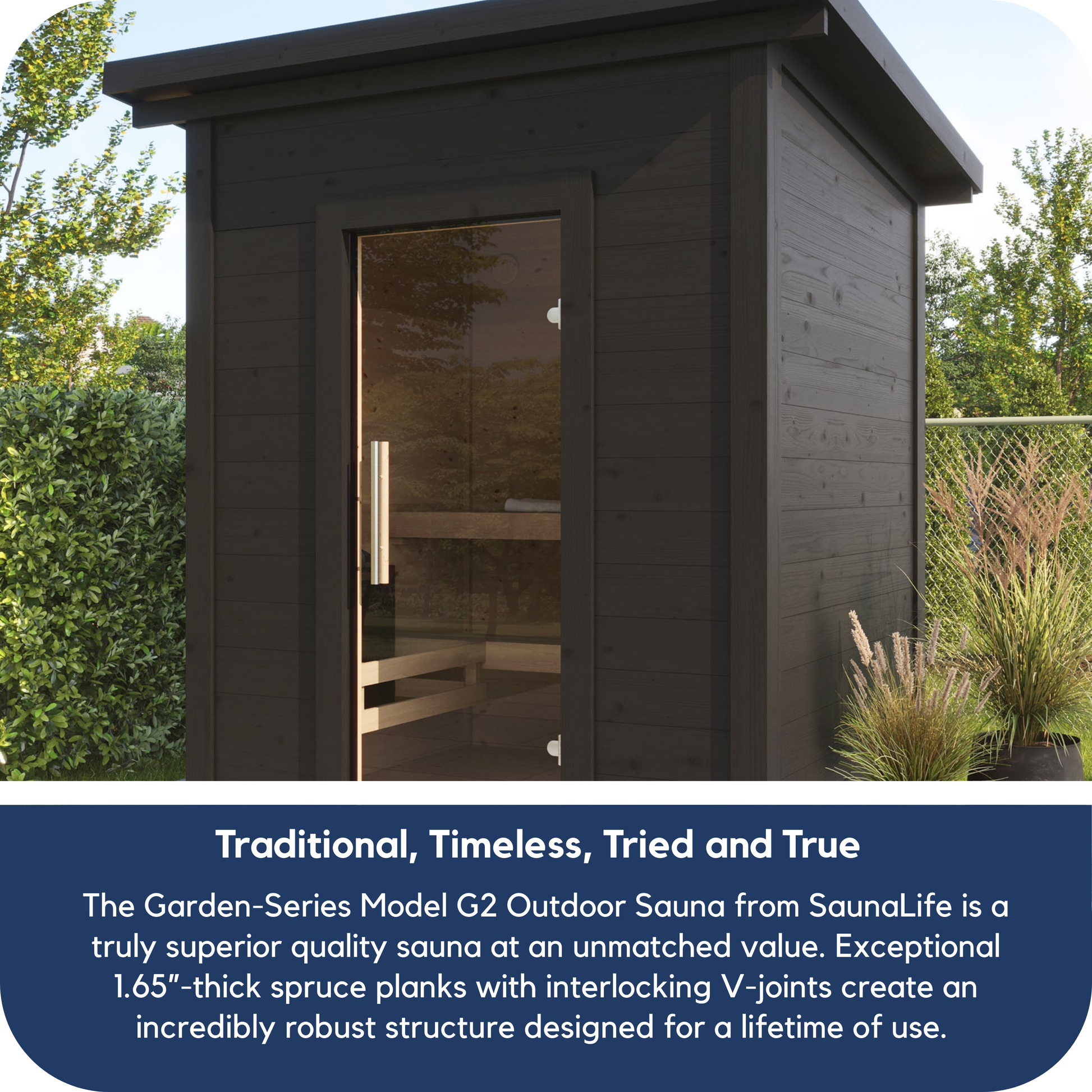 The SaunaLife Model G2 Garden-Series Outdoor Home Sauna DIY Kit is a premium backyard outdoor sauna built from 1.65β thick Nordic spruce with precision interlocking walls for superior heat retention and structural durability.