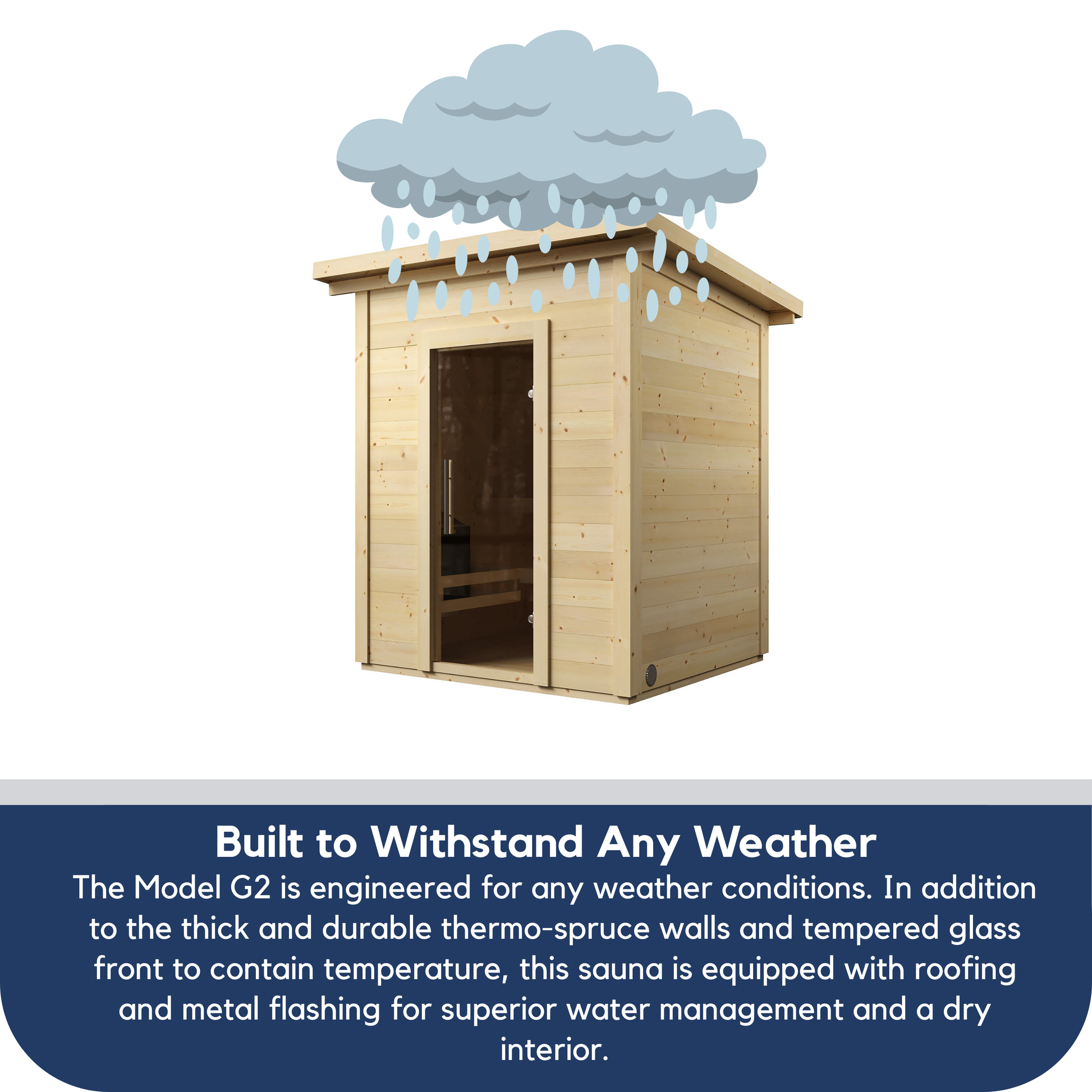 Designed for year-round outdoor performance, the G2 features a sloped roof with EPDM roofing membrane, full floor system, ergonomic Aspen benches, integrated LED light system, and an 8mm tempered glass door with premium hardware.