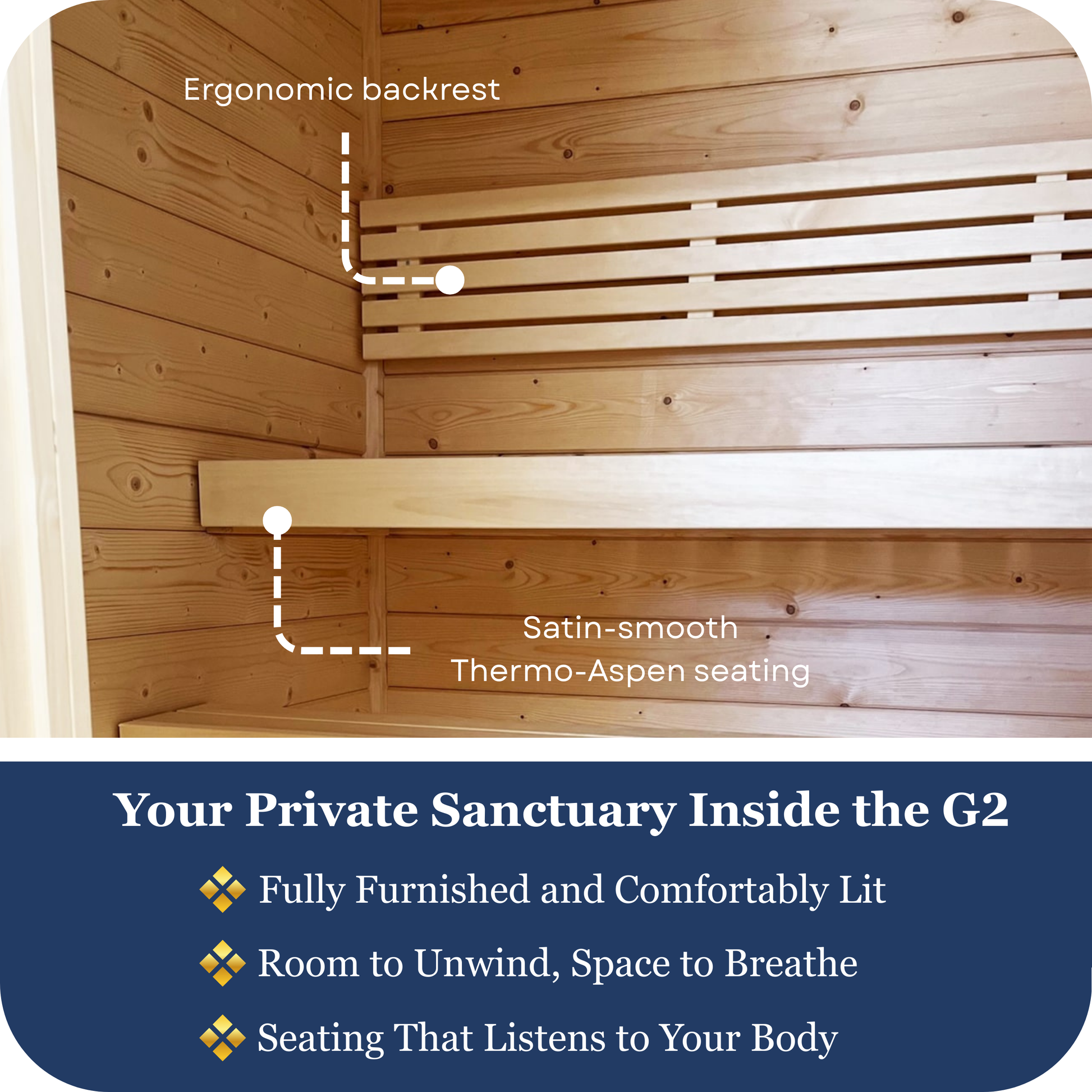 Didn't expect to love the G2 this much, but here we are! Fits four people comfortably, heats up fast, and is just the best way to end a long day. I've noticed my skin feels better since using it, and my husband swears it's helped with his sore muscles. Shipping was quick, and the sauna arrived in perfect condition